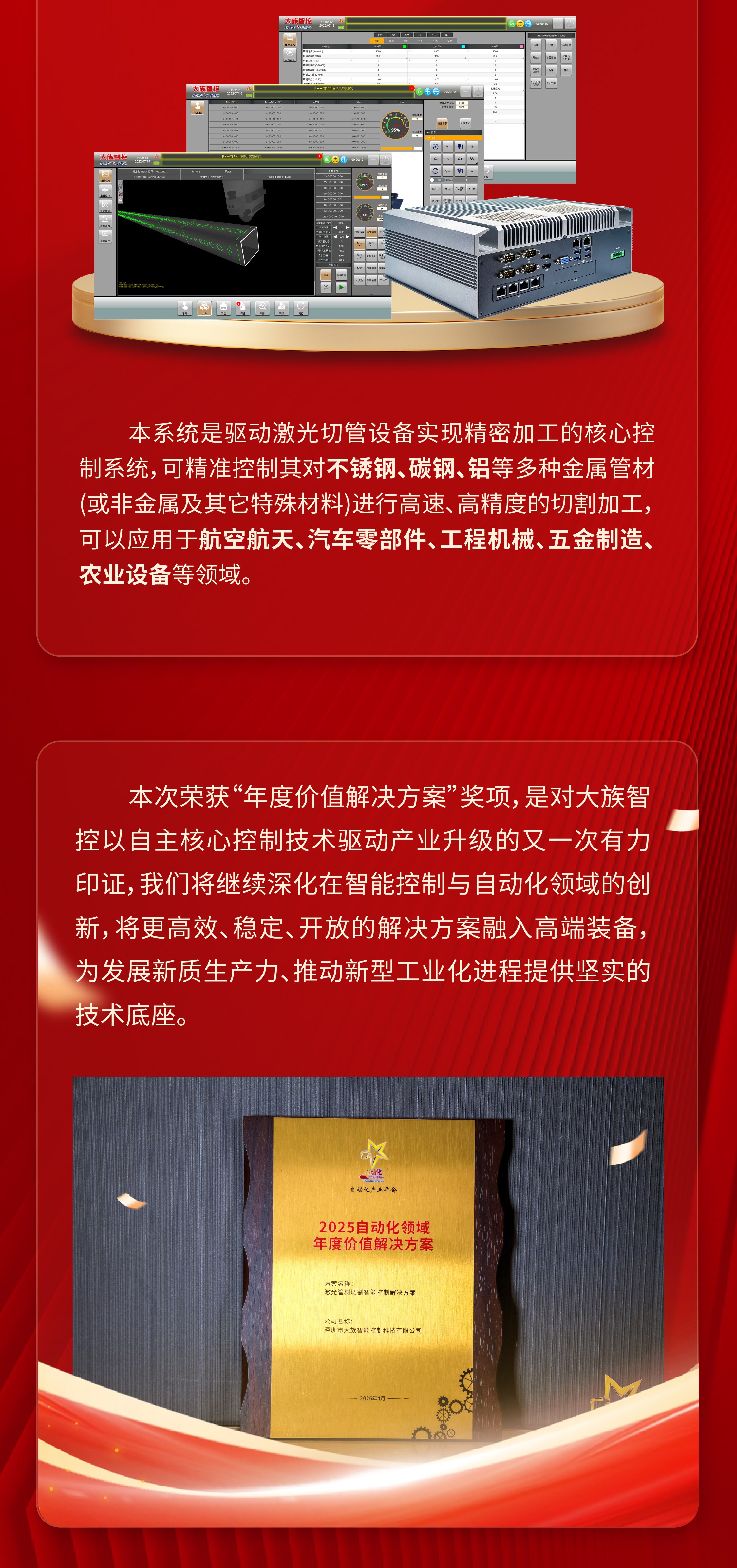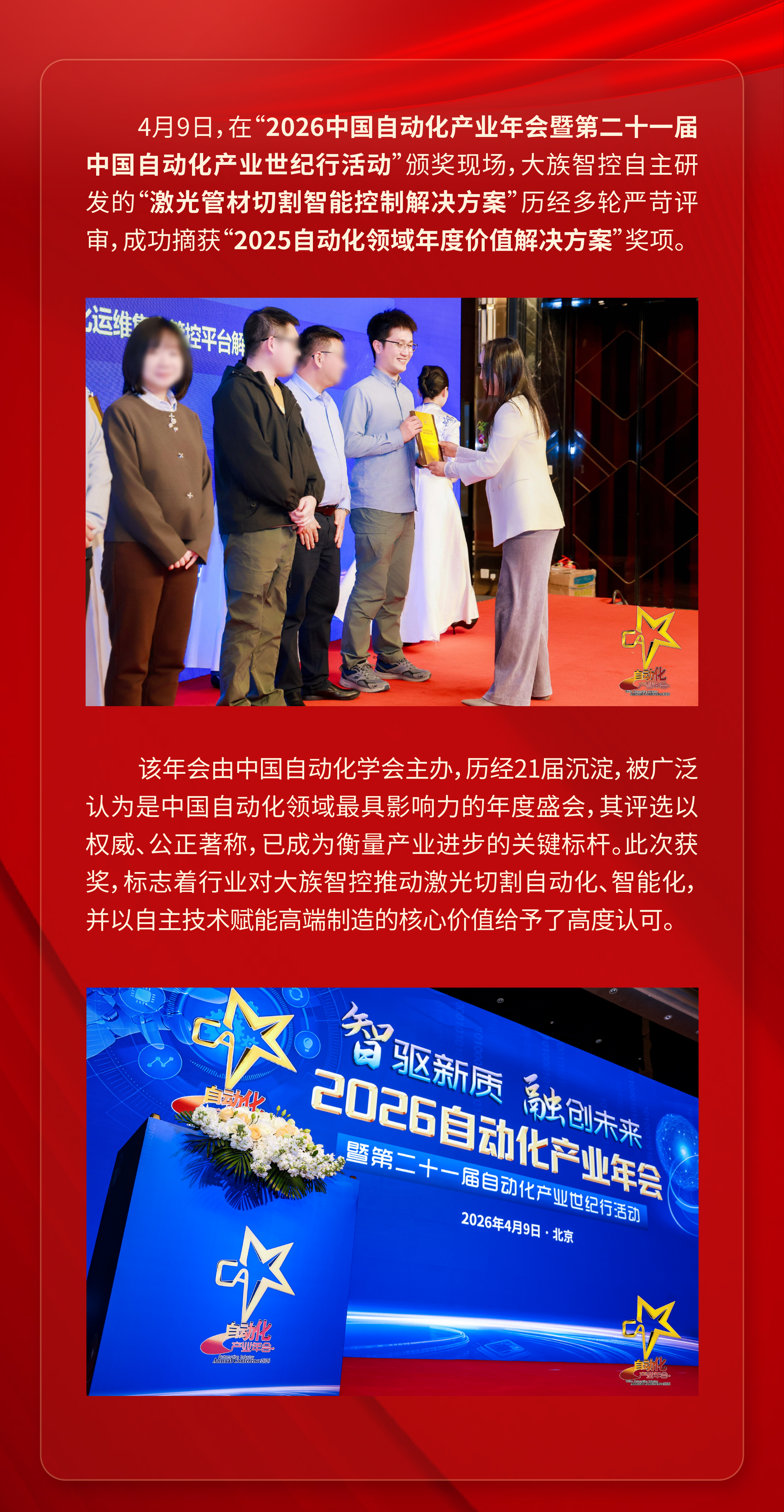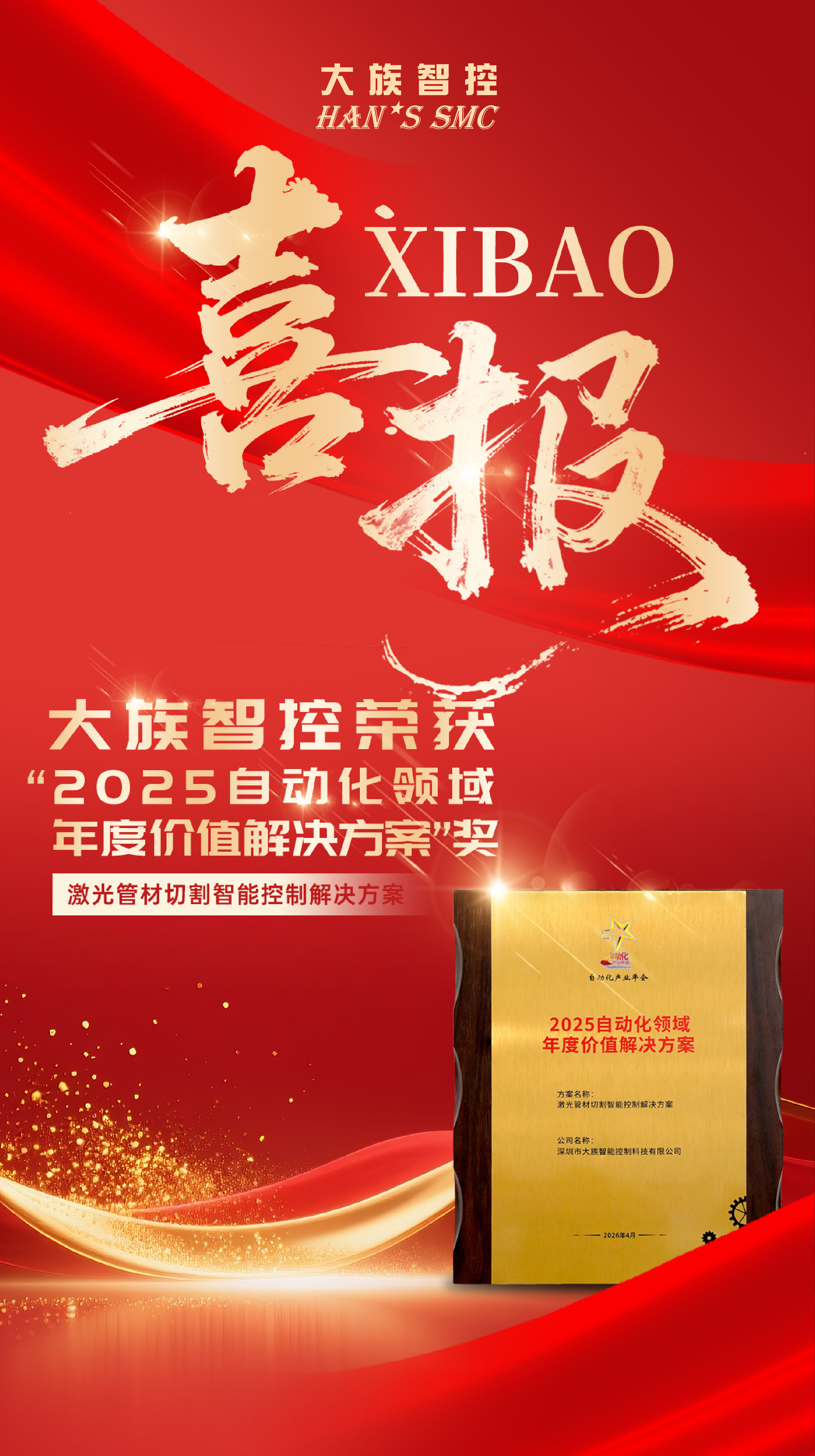 关键词:喜报丨大族智控荣获中国自动化产业年会“2025自动化领域年度价值解决方案”奖!2026中国自动化产业年会暨第二十一届中国自动化产业世纪行活动、大族智控激光管材切割智能控制解决方案、HAN'S 801-Tube系列激光切管数控系统、