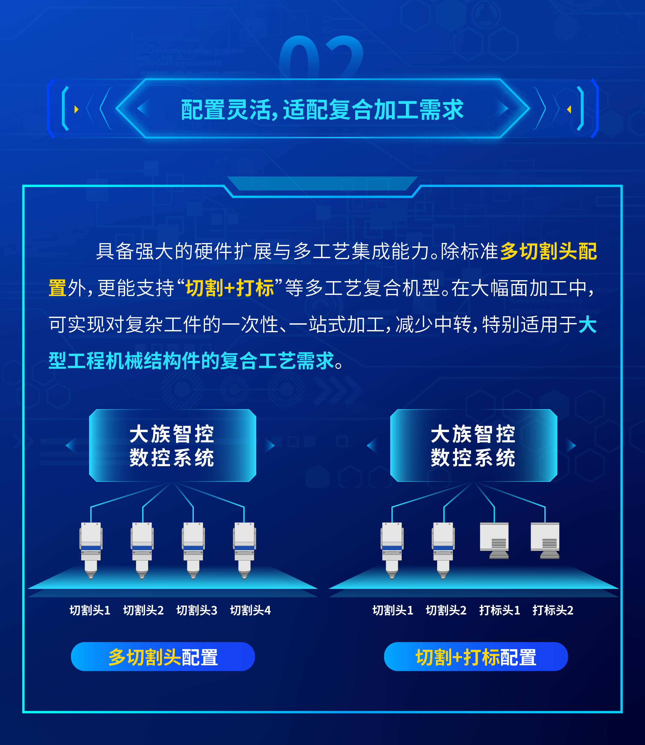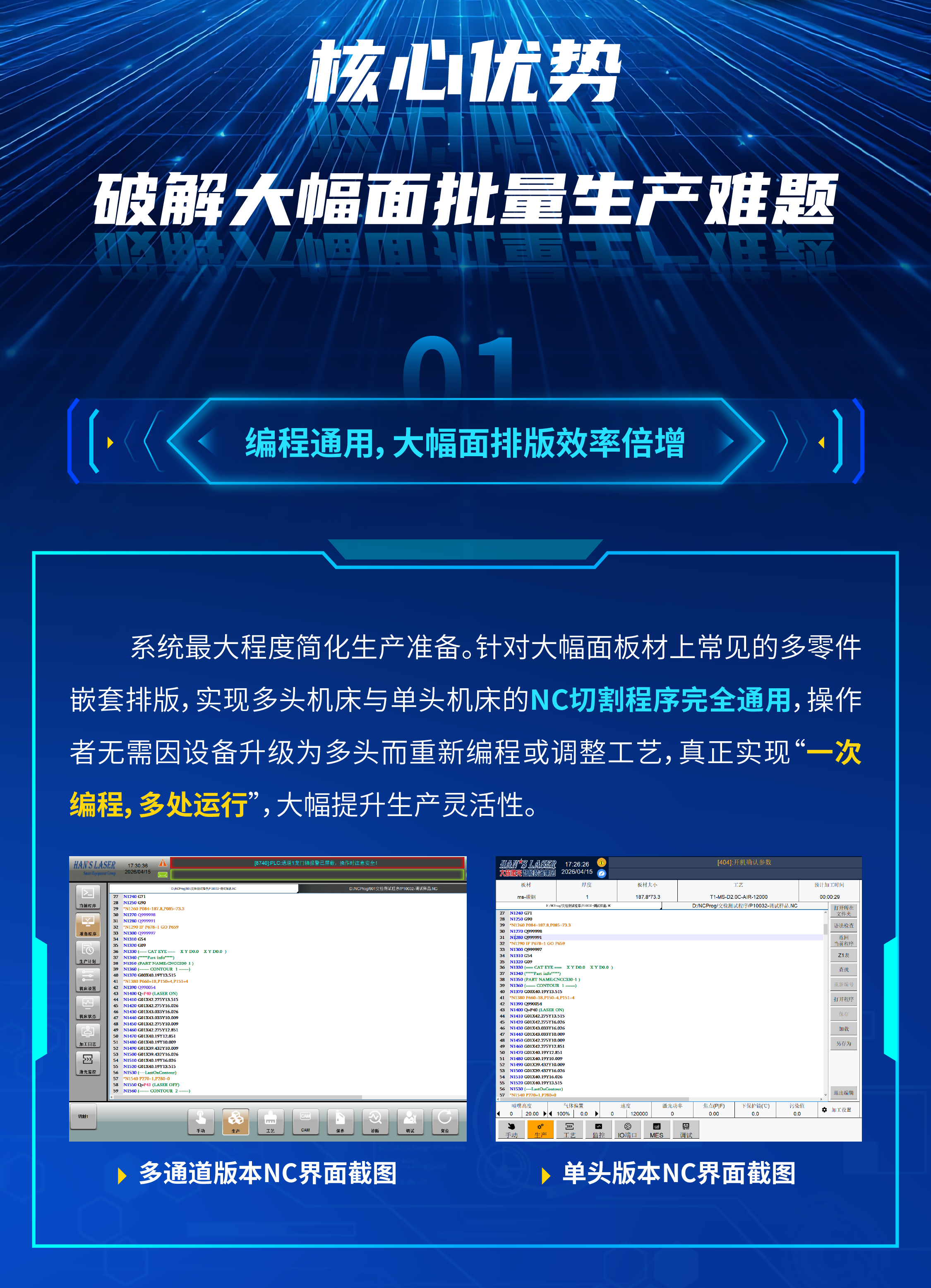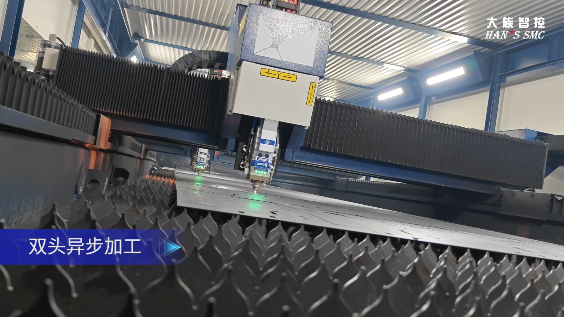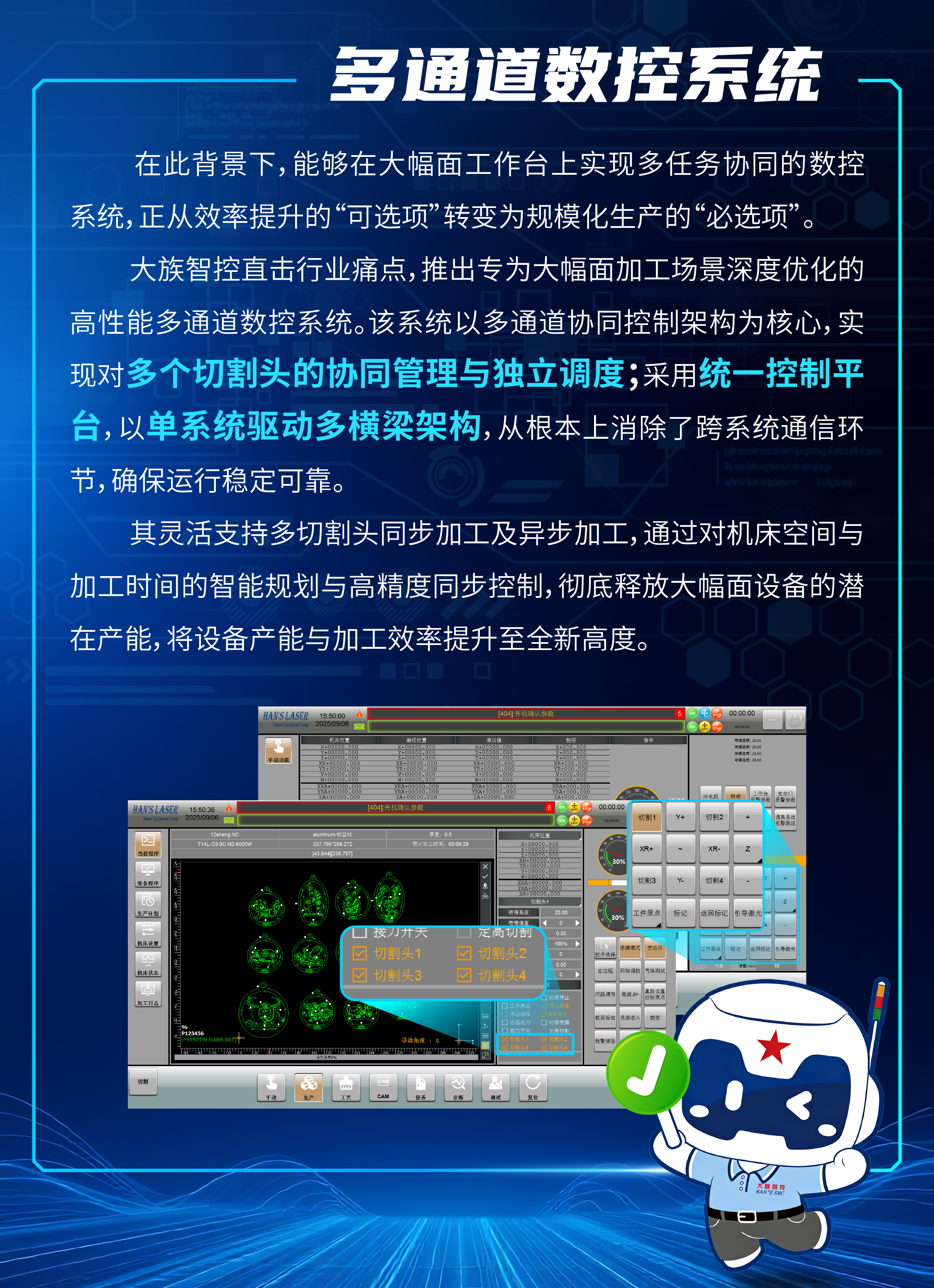关键词:产能革新,效率倍增|大族智控激光大幅面切割多通道数控系统介绍、双头异步加工、四头同步加工、切割+打标同步加工